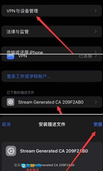 2.依次在手机中进行安装CA证书,打开设置,找到vpn与设备管理,点击刚的文件安装。