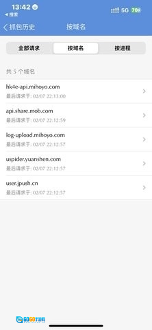 5.之后返回stream点击【开始抓包】,返回【原神】点击历史记录的下一页。6.回到stream点击【结束抓包】,历史抓包,找到日期,选择【按域名】。