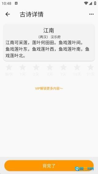 3、挑选你想背诵的古诗,反复强化记忆,等背诵完成后,点击“背完了”按钮,就能切换到下一首继续背诵。
