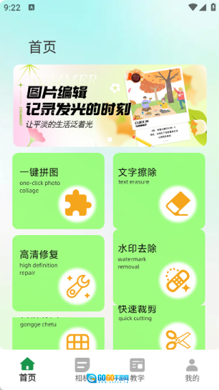 1、首页配备了一键拼图、文字擦除、同清修复、水印去除、快速裁剪等实用功能;