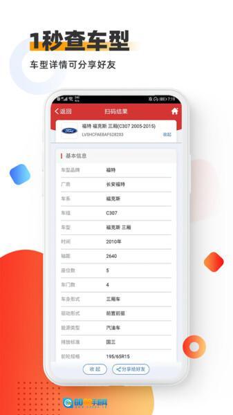 快:扫描VIN码(车架号),1秒就能查询车型,3秒即可获取汽配件型号;