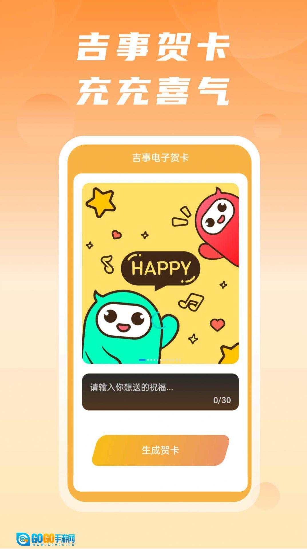 吉事快充是一款专业的贺卡制作软件,用手机就能制作各类贺卡。逢年过节时,你可以用它亲手制作贺卡送给亲朋好友,为他们送上祝福。就算没有高超的技术,也没有电脑,想做精美的贺卡,用这款软件就可以实现。