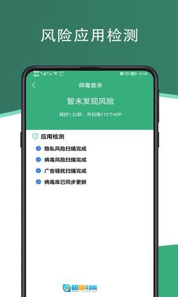 一键检测风险应用,搭载先进病毒查杀引擎,病毒库实时更新,检测全面无死角,全方位维护您的隐私安全,为您的手机信息保驾护航。