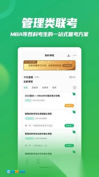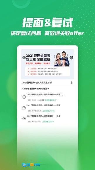 涵盖mba、mpacc、mem等管理类联考视频与直播课程,紧扣大纲,直击考点;同时提供免费面试与复试辅导,助用户一站式通过考试。