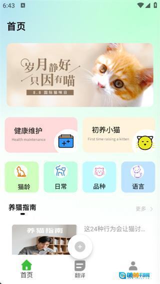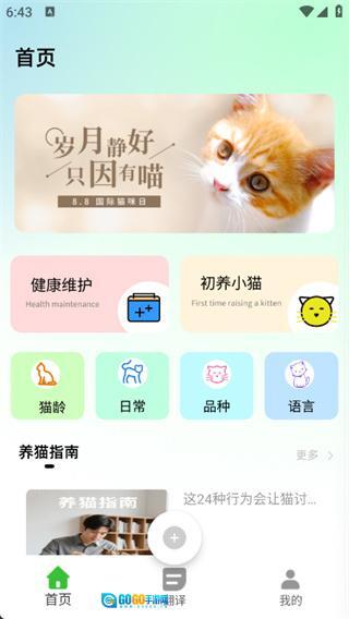 首页设有健康维护、初养小猫、猫龄等板块,同时提供养猫指南。