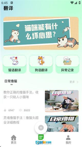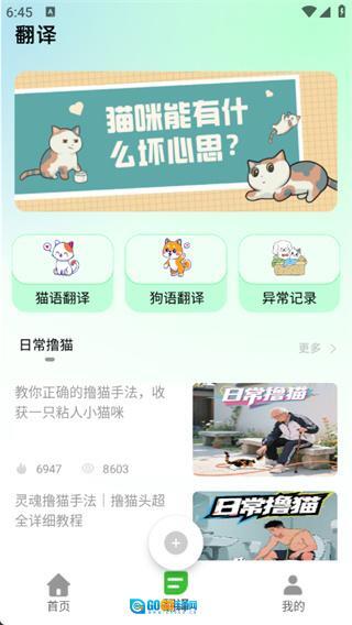 4、翻译页面设有猫语翻译、狗语翻译及异常记录功能,还能获取日常撸猫的相关资讯。