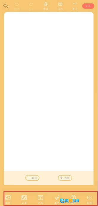 三、在下方的工具栏里,能够添加图片、背景、文本、贴纸之类的元素来美化手帐。