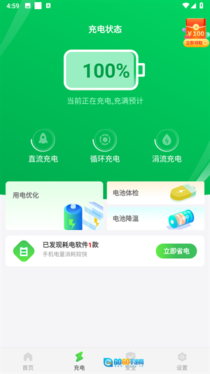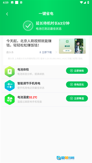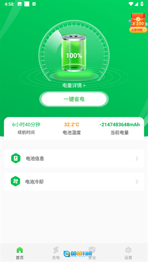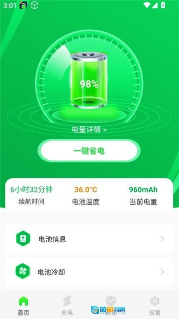 手机省电王的使用方法 1、打开软件进入首页,能看到电池信息和电池冷却这两个功能,点击一键省电按钮即可。