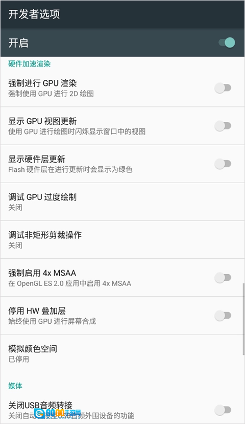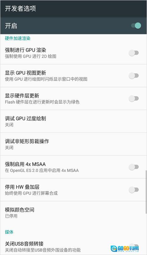 我们还可以开启【强制进行GPU渲染】、【强制启用4x MSAA】和【停用HW叠加层】这三项设置,让手机运行得更加流畅。