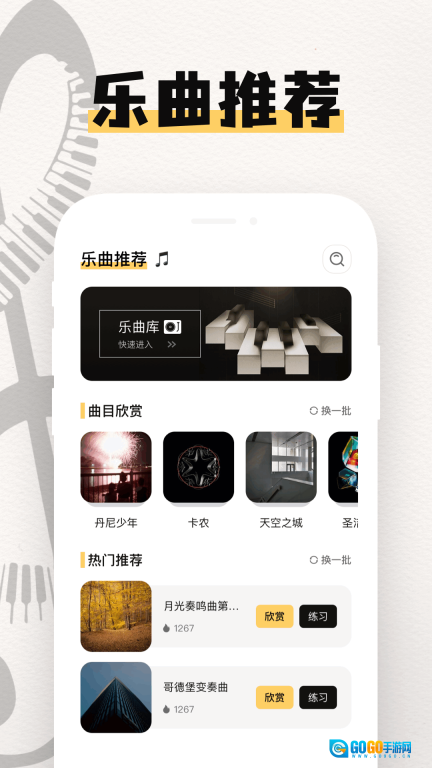 2、界面的设计非常简单,乐曲推荐给不同的用户使用