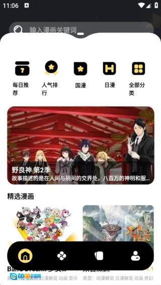 1、精选推荐火热漫画,还有每日推荐、人气排行、国漫、韩漫、全部分类等分类标签。