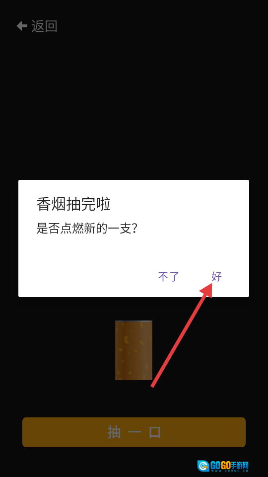 4、当香烟抽完的提示弹窗出现时,点击【好】按钮,即可点燃新的一支香烟。