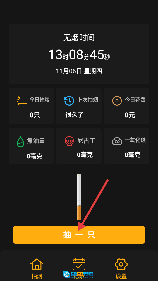 2、进入控烟应用的主界面后,点击【抽一只】按钮,即可启动模拟抽烟的流程。
