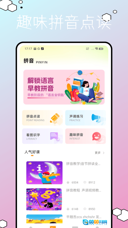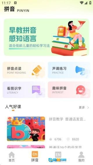 3、拼音学习界面包含拼音点读、音调练习、看图识字等功能,用户可以轻松掌握这些内容。