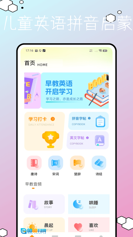 3、拥有丰富多样的音频学习功能,涵盖早教、故事、哄睡等不同类型的音频内容,孩子可以借助听读的形式,学习规范的发音,同时积累诗词方面的知识。
