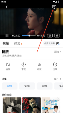 2、在影视剧的播放页面,找到并点击右上角的TV投屏按钮。