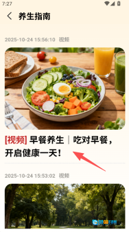 2、打开养生指南板块,找到早餐养生相关的视频并点击进入,浏览其中的养生知识内容。
