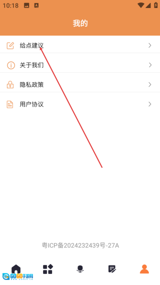 在个人中心页面,点击【给点建议】选项,即可进入建议反馈的操作界面。