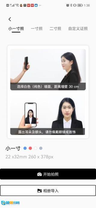 3、点击证件照选项后,可挑选对应的尺寸规格,查看详细的拍摄指导,随后选择直接拍摄或从相册导入照片的方式来制作证件照;