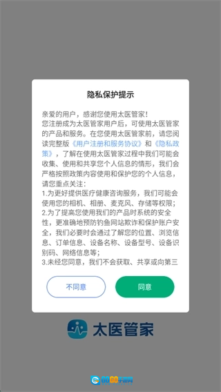 1、太医管家的最新版本,安装完成后打开会出现弹窗,直接点击同意即可。