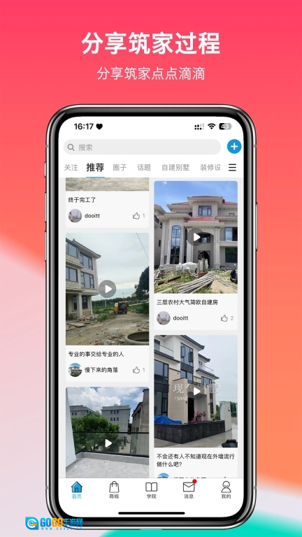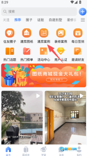 1、围绕建房主题展开内容布局,设置关注推荐等板块以及住友圈子建房案例等功能入口,按不同风格分类展示建房相关内容,且均以图文结合的形式呈现。