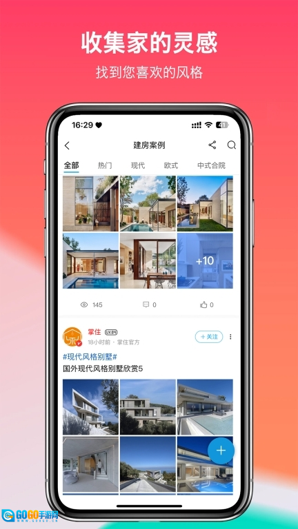 1、建房案例按风格分类展示,包含现代、欧式、中式、合院等多种类型,能满足不同用户对于建房设计的参考需求。
