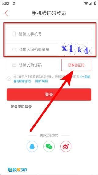 3、进入手机验证码登录界面,填写手机号与图形验证码后,点击“获取验证码”按钮。