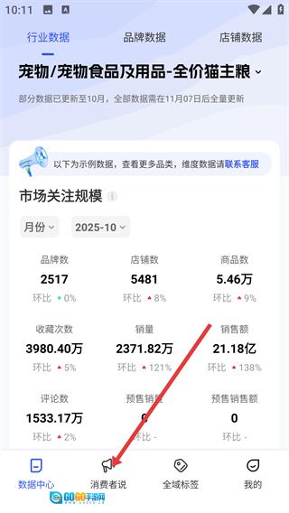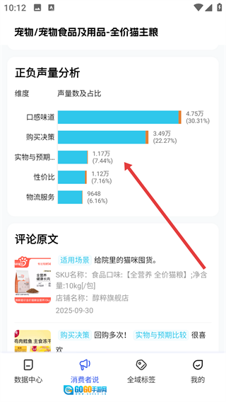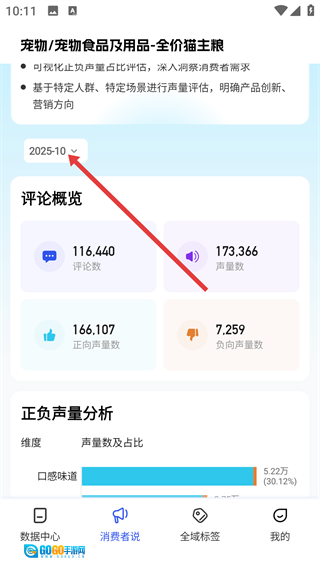 1、在数据中心页面,点击底部的【消费者说】选项,即可进入消费者评论分析页面。