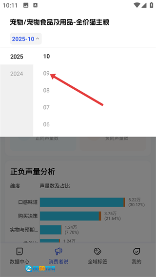 2、进入消费者说页面后,点击【2025-10】下拉框,即可展开月份选择列表。