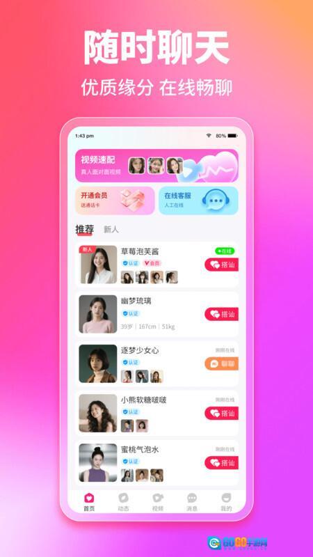 1、首页设有视频速配功能供用户体验,同时也为大家推荐了众多优质的用户群体;