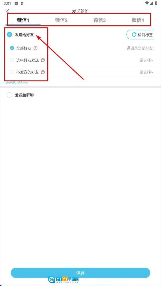 4、进入发送对象选择页面后,需选定微信账号并设置发送好友范围,操作完成后点击【保存】按钮,即可结束相关设置。