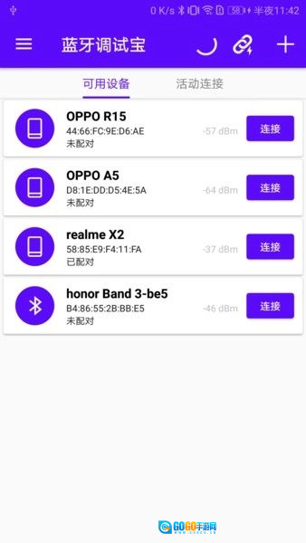 蓝牙调试宝可依据设备名称、MAC地址、信号强度、是否已收藏等条件对搜索结果进行筛选。它还支持多设备同时连接、循环搜索设置以及自动确认UUID。实时展示搜索到的设备信息(如信号强度、MAC地址、配对状态等),便于用户清晰查看。另外,该应用具备扫描含设备MAC地址的二维码以实现快速连接的功能。