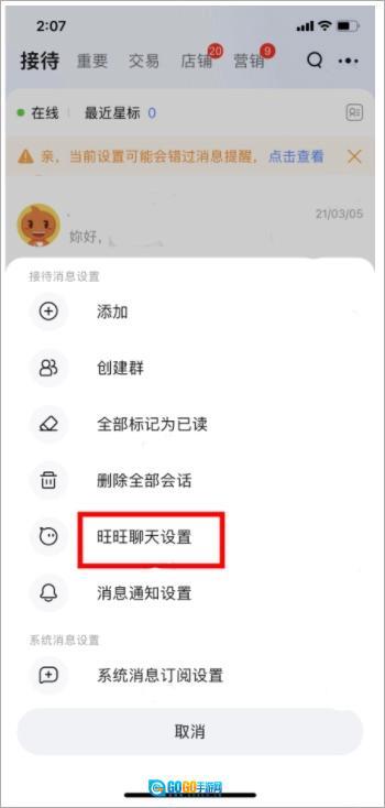 2、在底部弹出的选项中点击【旺旺聊天设置】