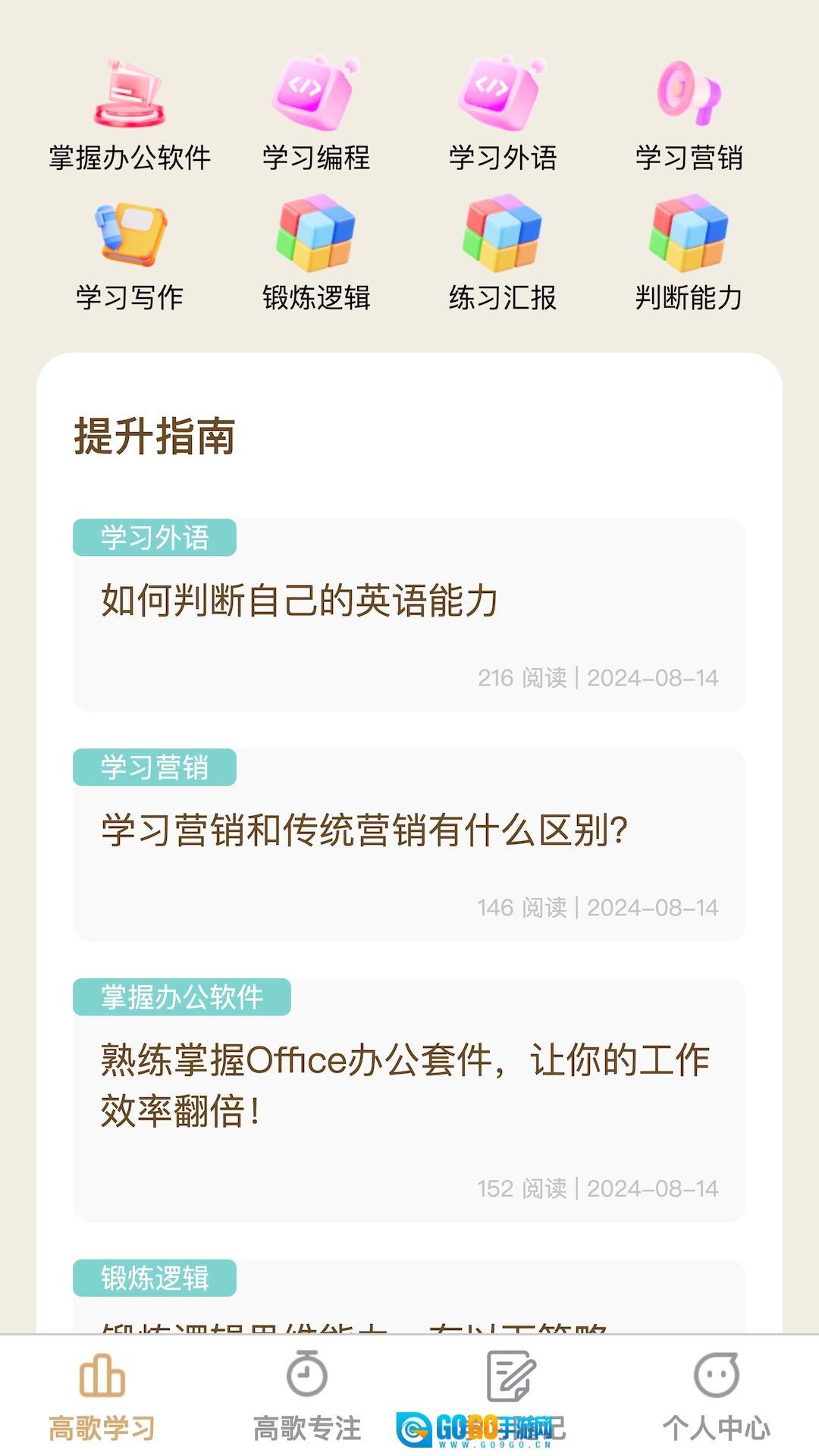 步步高歌是一款融合学习、专注与记录功能的应用,致力于为用户打造全方位的学习体验。用户可以随时随地获取海量学习资源,从而提升自我认知水平与专业技能。无论您是希望在专业领域深入钻研,还是在个人成长道路上不断探索,步步高歌都能为您提供实实在在的支持与帮助,陪伴您走好每一步学习之路。