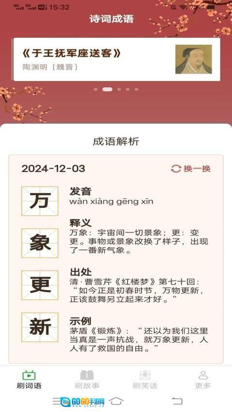 1、打开首页后,选择你想要观看的诗词并点击进入,就能看到详细的解释,从而更好地了解文章的具体内容。