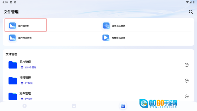 2、进入文件管理页面后,找到并点击【图片转PDF】功能选项,即可跳转至图片选择页面。