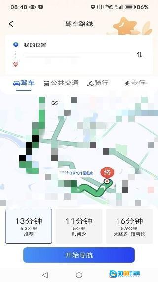 3、一键搜索功能,能够提供驾车、公共交通等多种不同的路线选择,十分丰富多样。