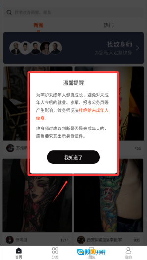3、留意纹身师的最新动态,在其个人主页查看作品集,点击关注后就能及时收到他们发布的新作品消息。