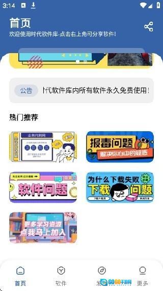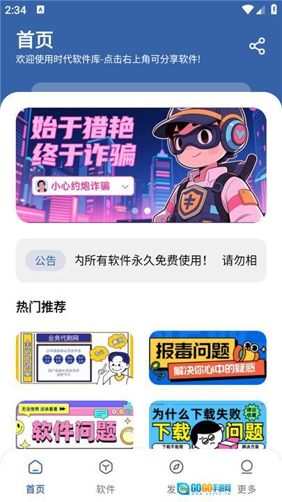 2. 进入“首页”后,可查看热门推荐软件及相关公告,借助这些内容能够知晓软件库的最新动态与推荐信息。