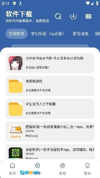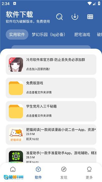 3. 点击“软件”板块后,会展示出软件列表,里面有免费版游戏、学生用文件、实用软件等内容,还可以借助搜索功能或分类筛选来查找需要的软件。