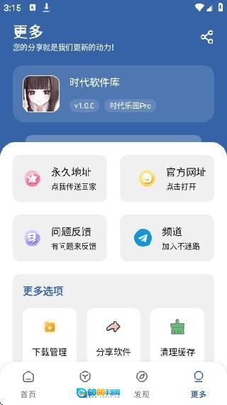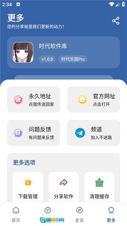 5. 在“更多”板块中,用户可以查看软件的版本信息,同时也能使用永久地址、网址、问题反馈、频道等功能。