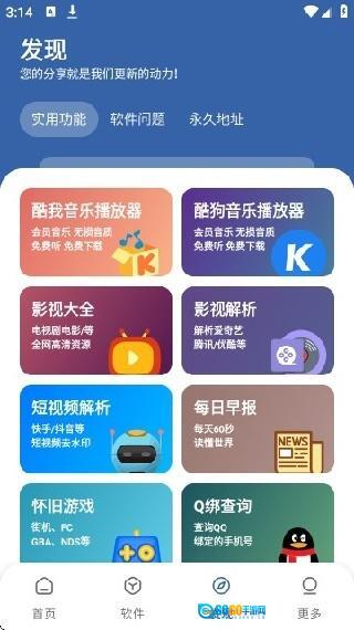 4. 进入“发现”板块,能看到实用功能、软件问题、永久地址等内容,音乐播放器、影视解析、短视频去水印等工具都在这里。