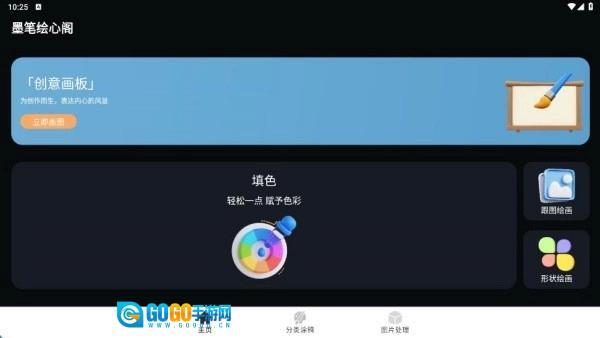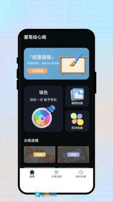 安装后进入主页,能看到创意画板、填色等功能,可轻松开启使用。