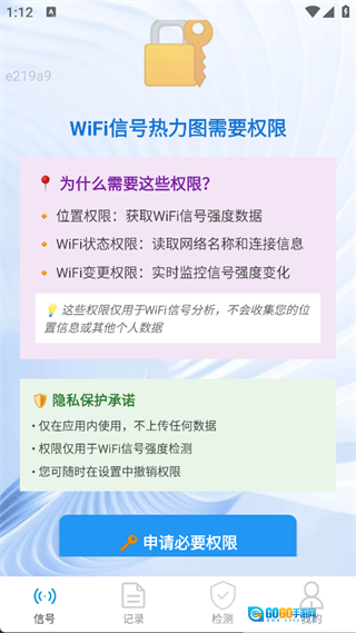 2. 在主页面即可申请必要权限,进行网络信号检测;