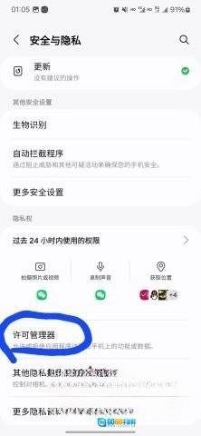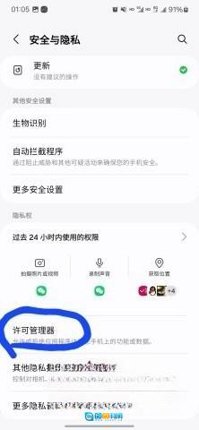 首先打开你的三星手机,找到并点击三星应用商店,接着选择“安全与隐私”选项,随后进入“许可管理器”。