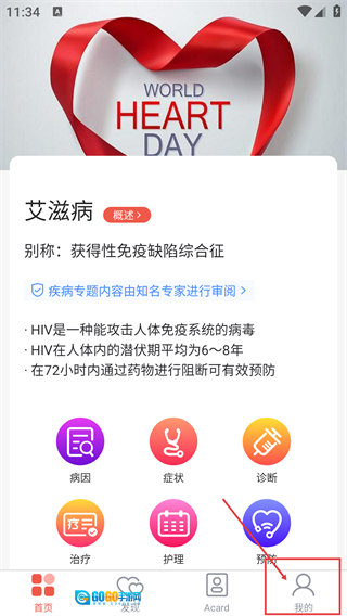 在艾滋病疾病介绍页面,点击底部导航栏的【我的】按钮进入个人中心页面后,就能开展账号相关操作和设置调整了。