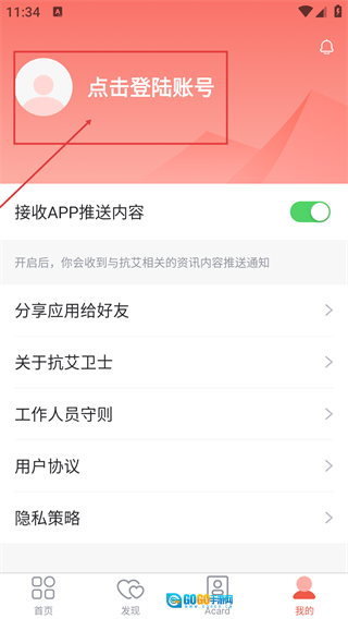 2、进入个人中心页面后,找到并点击【点击登录账号】区域,即可跳转至【抗艾卫士】的登录界面,以便进行账号登录操作。