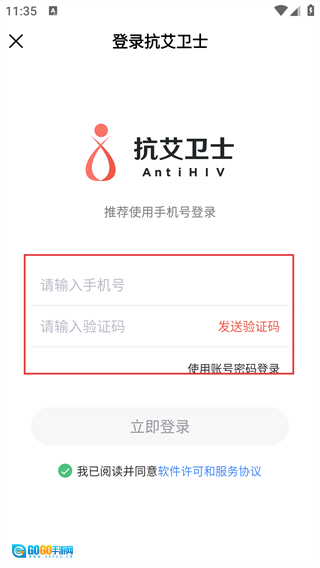 3、进入【登录抗艾卫士】页面,选择手机号登录的方式,在【请输入手机号】栏填写号码后点击【发送验证码】按钮,以获取验证信息。