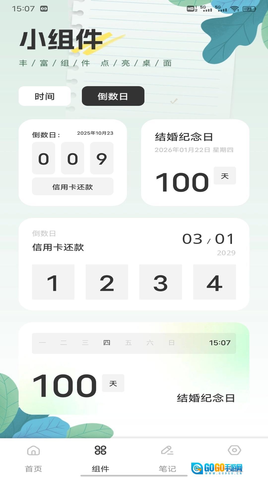提供时间、倒数日等类型的小组件,展示信用卡还款倒数、结婚纪念日倒数等。