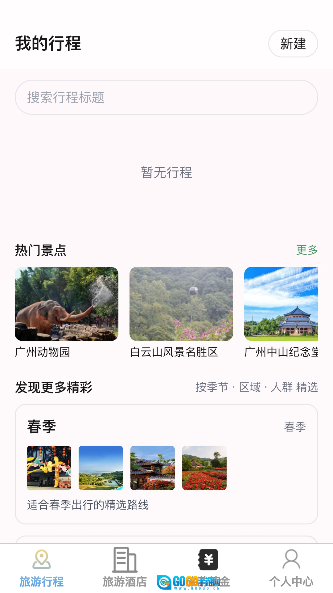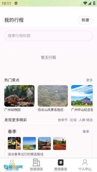在行程管理板块里,你可以创建新的行程安排,也能通过搜索行程标题快速查找,另外还有热门景点的推荐内容,能给你的行程规划带来一些参考思路。